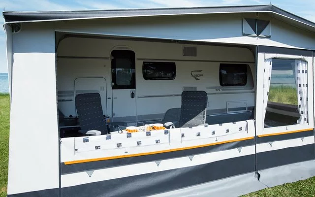 Ganzjahresvorzelt, 7-teilig. Zelttiefe: ca. 240 cm. Vordach: ca. 20 cm.