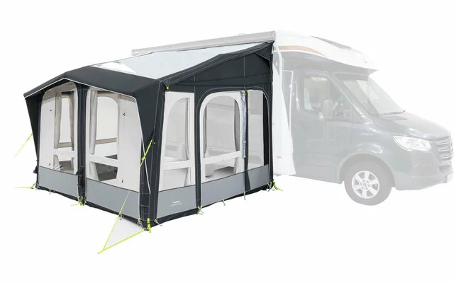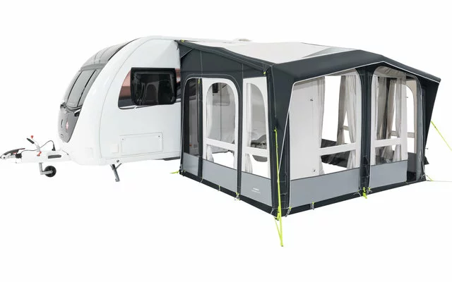 Mit seiner bahnbrechenden Vielseitigkeit passt das Club AIR Pro 330 zu einer Vielzahl verschiedener Campingfahrzeuge. Dank des patentierten Multi-Height-Systems kann das aufblasbare statische Vorzelt sowohl bei Wohnwagen als auch bei Reisemobilen mit Kederanschluss verwendet werden, die auf verschiedene Höhen einstellbar sind. Einfach die Reißverschlüsse der Seitenwände öffnen, das Vorzelt zur Feinabstimmung der Passform mit Heringen befestigen, dann die Innenreißverschlüsse schließen, um überschüssiges Material zu verstauen. Die Dual-Pitch™-Dachspitze und ein integriertes Vordach verleihen dem Club AIR Pro seine unverwechselbare Ästhetik. Die clevere Konfiguration der Vorderseite enthält zwei Türen. Öffnen Sie das Vorzelt, indem Sie einfach den Reißverschluss aufziehen und die Wandelemente abnehmen – so entsteht ein Verandastil.