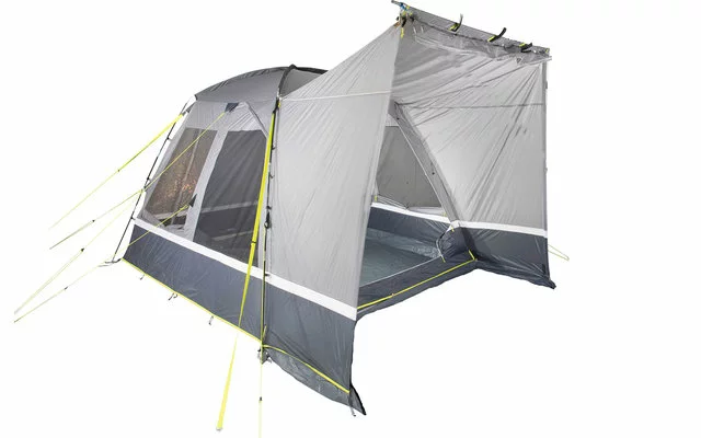 Die rechten Seitenwände bieten ein optimales Raumgefühl. 3 Dachstützgestänge stabilisieren das Zelt. Das Vordach mit Wetterblenden schützt vor Wind, Regen und bietet Schatten. Der fest vernähte Boden mit dem Außenzelt verhindert das Eindringen von Schmutz, Nässe, Krabbeltieren und schützt vor Zugluft. Die Verandafront lässt sich je nach Wetterlage bis zur Mitte oder ganz öffnen. Die Bodenwanne kann an der Front herunter geklappt werden und verhindert Stolperfallen. Gazefenster aus extra starkem, reißfestem 150D „Superfine“ Moskitonetz belüftet den Wohnbereich und halten Insekten aus dem Zelt fern. Die innenliegende Reißverschluss Fensterklappe ist einfach zu bedienen und wird variabel als Dauerventilation eingesetzt. Gaze-Seitentür aus 150D „Superfine“ Moskitonetz für mehr Bewegungsfreiheit und Belüftung. 2 Klarsichtfolienfenster mit innenliegenden Reißverschluss- Fensterklappen können einfach und variabel bedient werden. Eine Hochentlüftung belüftet das Zelt an regnerischen Tagen.