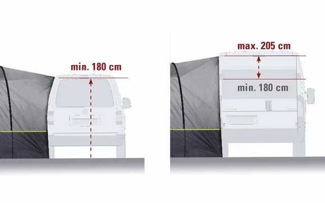 Das Vordach kann durch drei verschiedene Befestigungsmöglichkeiten am Fahrzeug angebracht werden. Der Doppelkeder mit 5,8/7,2 mm ist passend für alle gängigen Kederschienen. Die Klettbandschlaufen können an der Dachreling fixiert werden. Eine weitere Möglichkeit ist das Einziehen des Schleusenstabs in den Hohlsaum, der mittels Klemmen oder Abspannleinen fixiert werden kann. Das Trento ist für den schnellen Einsatz geeignet und nimmt wenig Transportgewicht sowie Volumen in Anspruch.