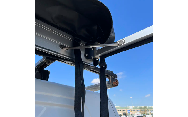 Es handelt sich um ein kleines, tragbares Zelt, das in wenigen Minuten direkt auf dem Dachgepäckträger des Fahrzeugs befestigt wird.