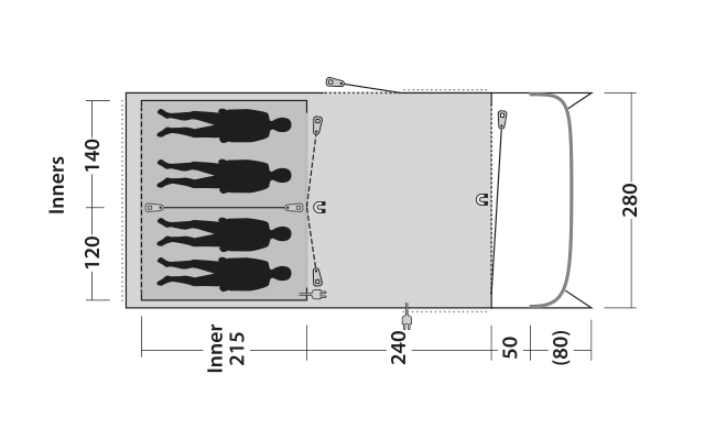 - Das helle Überzelt-Dach in einem warmen Farbton schafft ein helles, angenehmes Ambiente im Zelt Verstellbare Abspannpunkte für einen flexiblen Zeltaufbau