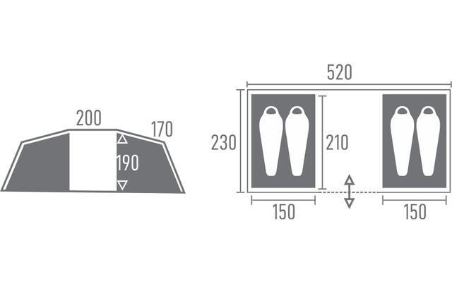 Der Wohnbereich des Zeltes ist mit 4,6 m² sehr geräumig und durch die Höhe von 190 cm kann man darin sogar problemlos aufrecht stehen. Die eingenähte Bodenplane sorgt dafür, dass auch krabbelndes Ungeziefer draußen bleibt und Deine Füße, sowie Deine Ausrüstung trocken bleiben. An der Seite des Zeltes ist ein großes, abdeckbares Fenster zu finden, welches für optimale Lichtverhältnisse beim Aufenthalt im Inneren sorgt. Der Eingang ist mit einer Gaze-Doppeltür versehen, sodass man vor Insekten gut geschützt ist und lässt sich mittels der mitgelieferten Aufstellstangen zu einem Vordach umwandeln.
