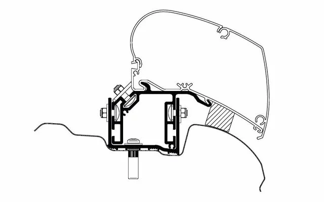Passender Markisenadapter für die Dachmontage der Markisen Thule Omnistor 6300/6200 am Fahrzeugtyp Volkswagen Crafter ab Baujahr 2017.
