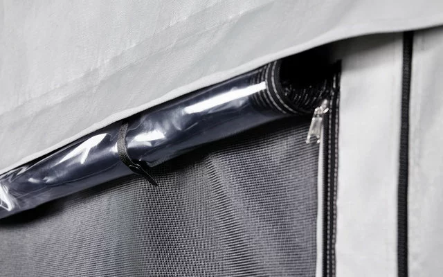 Die Seitenfenster sind von außen mit einer hochwertigen, leicht mittels Reißverschluss zu öffnenden Fensterfolie ausgerüstet. Zum Insektenschutz ist eine Fliegengaze auf beiden Seitenwänden serienmäßig.